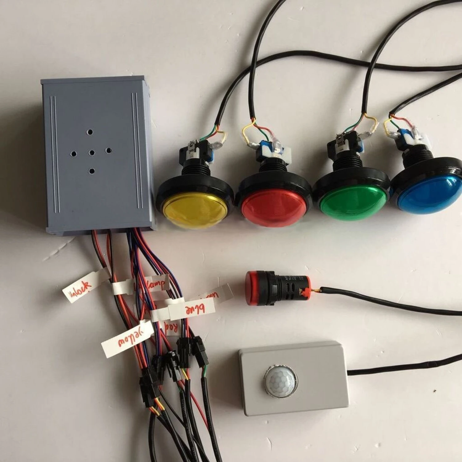 1. There are four colored buttons, a pilot light, and a moving sensor which has been connected with the controller.Â