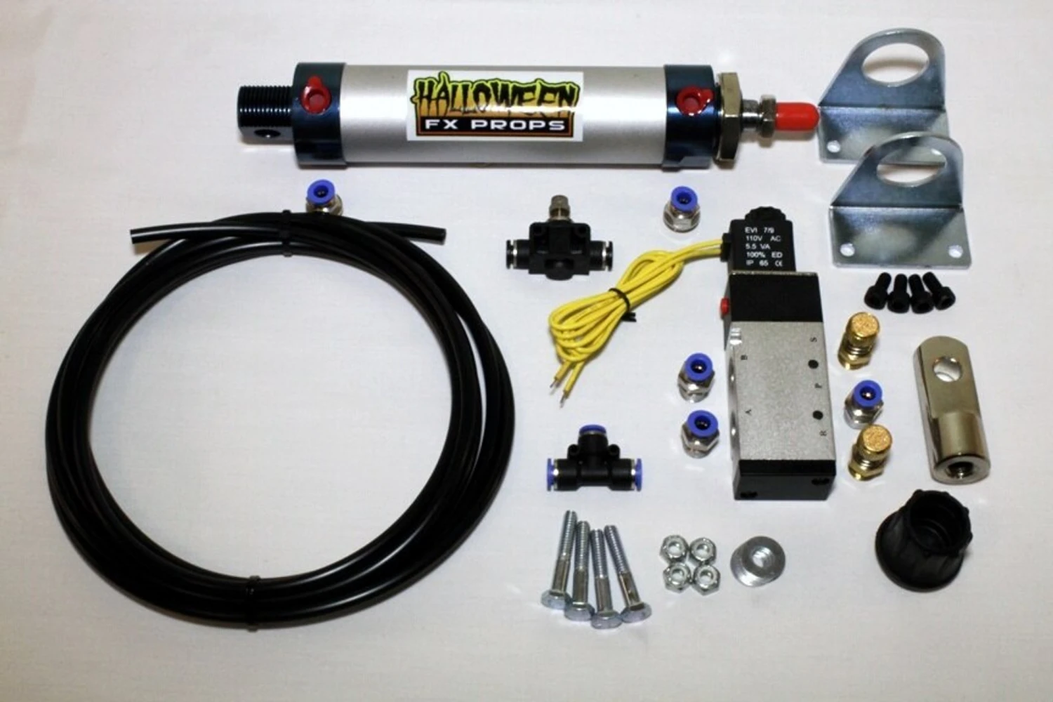 Heavy duty cylinder will lift up to 200 lbs! Mount these parts at the bottom of an old 55-gallon drum, or any large prop, and make it bounce off the floor. By adjusting the pressure on the solenoid you can choose from slow lifting to hopping. Includes all mounting brackets, bolts, cylinder, solenoid, tubing and fittings.