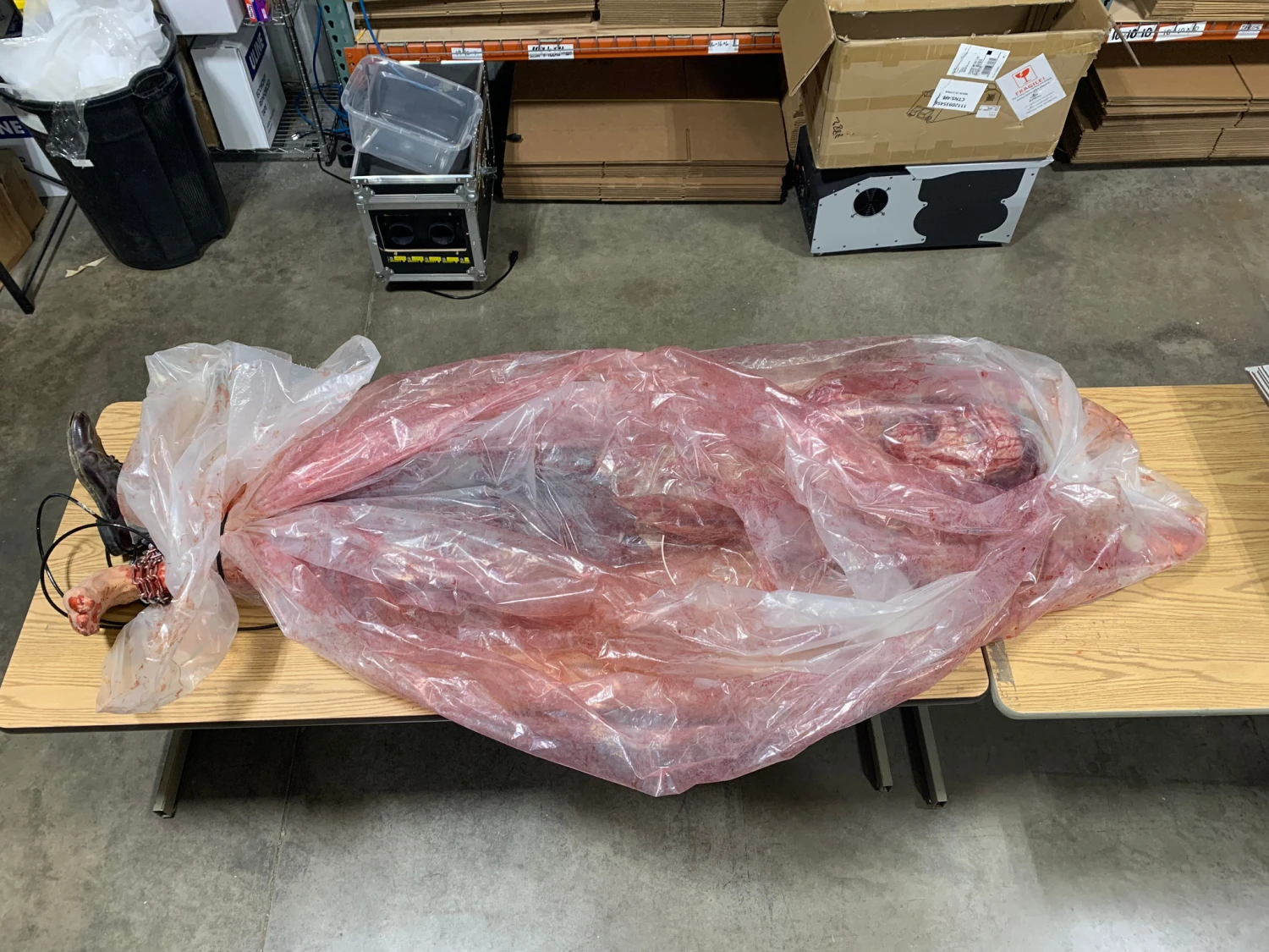 This gory mech hangs up side down by its chained feet. The life sized dummy is nearly 7 feet long with its arms dangling above its head. While eerie on its own, when hooked up to an air compressor this prop comes takes it to the next level by coming to life and flailing away from inside its bloody body bag. Â