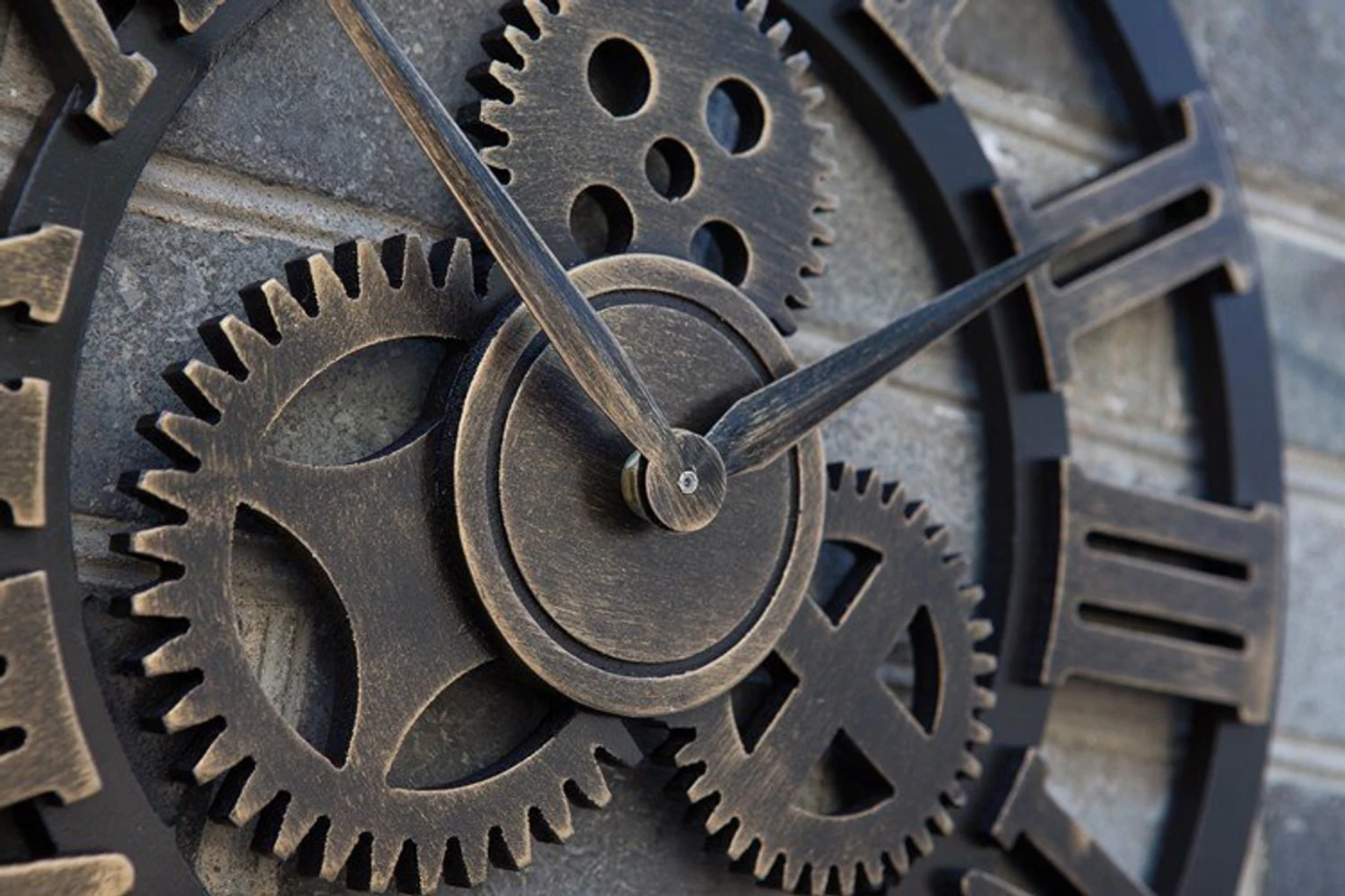 This is a handmade large vintage-style decorative wooden wall clock designed with a big gear decoration and full of metallic texture, art, and industrial framing.