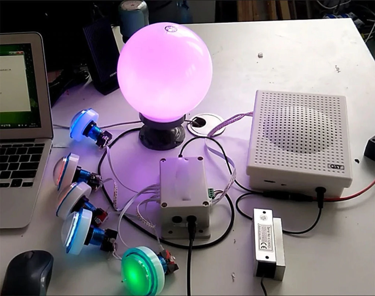The LED sphere will light up 15 different colors randomly. Each of the 5 accompanying LED buttons will light up different different colors as well. Players must press the colored buttons at the moment they match up in color to the sphere. When players connect the parallel sphere by hitting all 5 buttons while they match up, the lock will open.Â