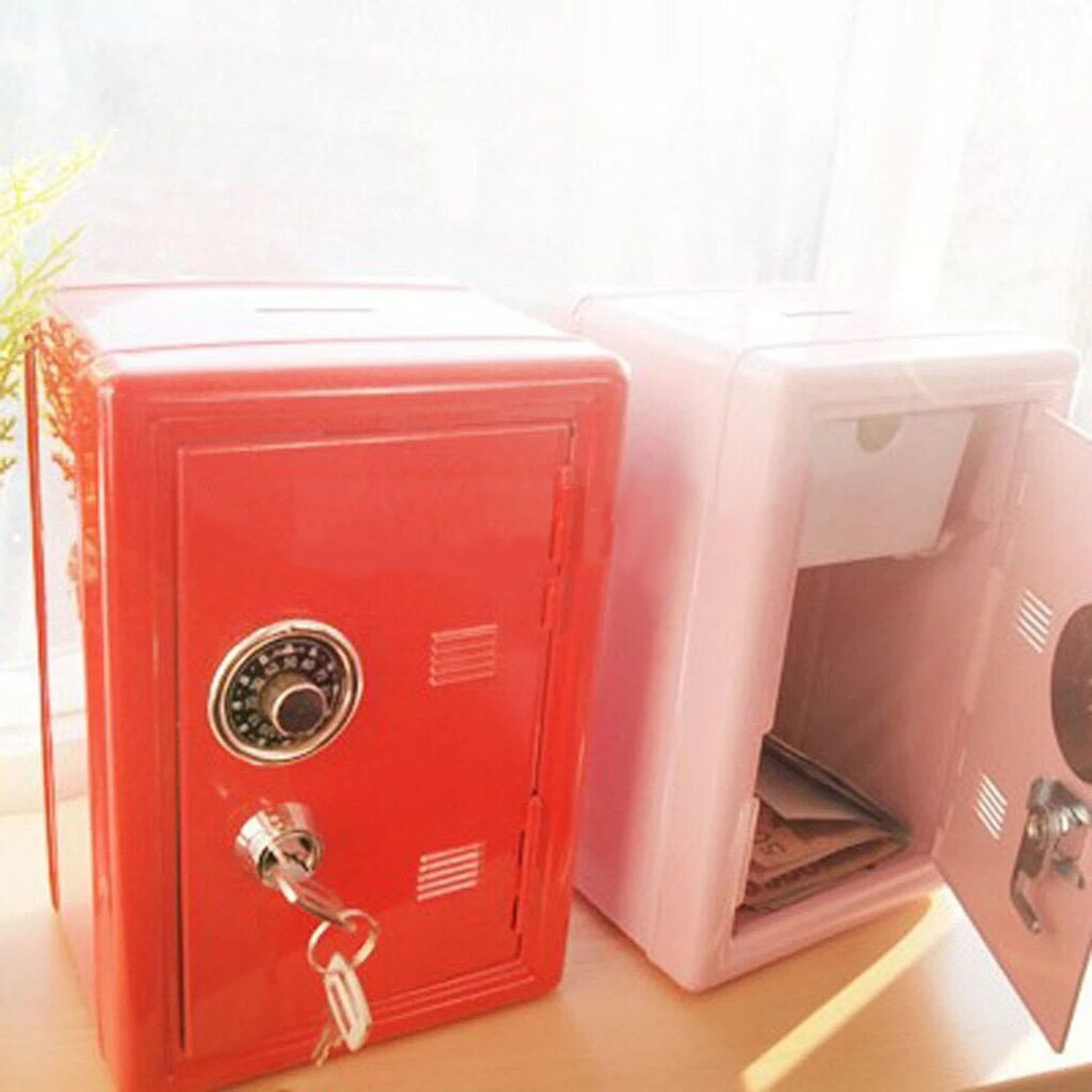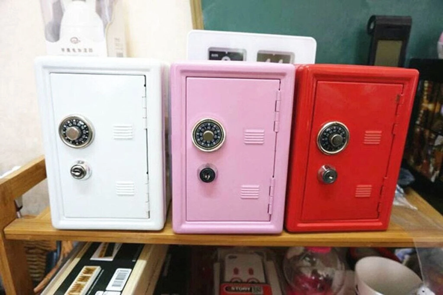 Miniaturized steel safe with password combination lock. Please inquire about color variations and dimensions.