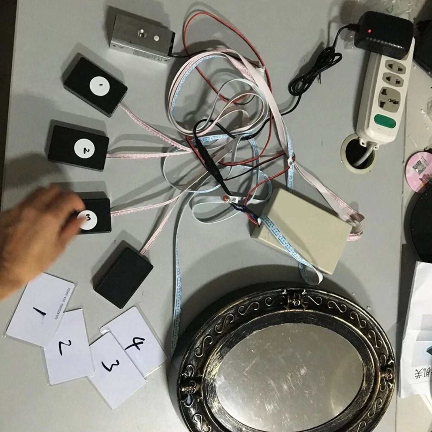 Adventurers have to find the four goods (can be anything) and align them with the four sensors to trigger the magic mirror. The image display can be customized.Â