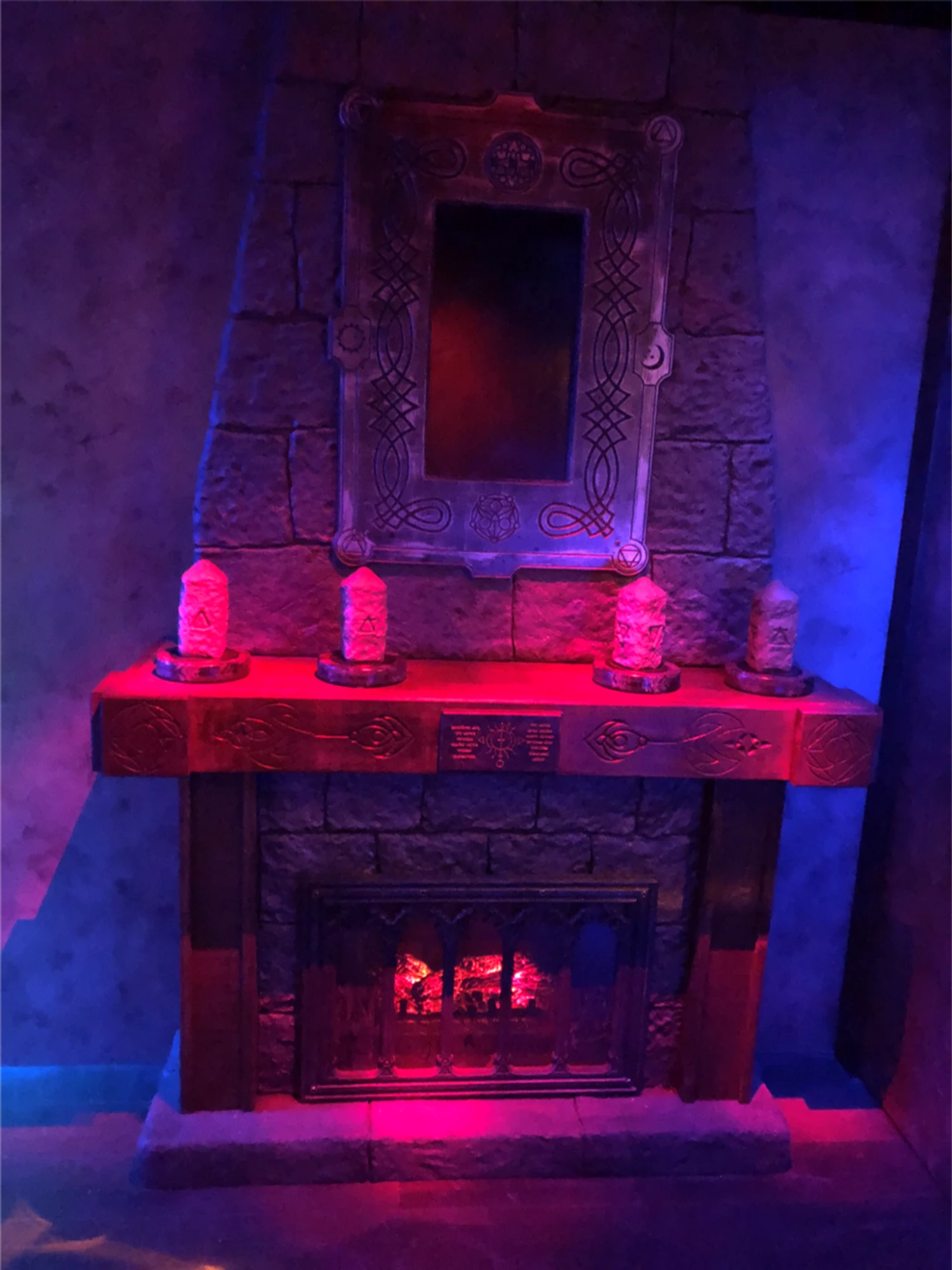Rotate the 4 crystal to the correct location to illuminate them and open the included maglock! Includes decorated shelf as shown. Does not include fireplace.